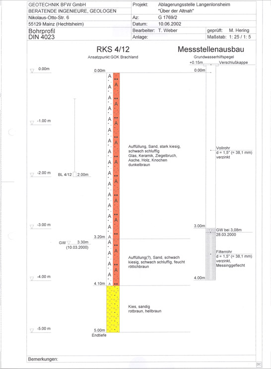 Für die Gemeinde Langenlonsheim wurde eine Grundwasserüberwachung zur Überprüfung einer möglichen Beeinträchtigung des Grundwassers durchgeführt. Hierzu wurden Untersuchungen am Ablagenkörper selbst sowie außerhalb und unterhalb der Ablagerung erforderlich.