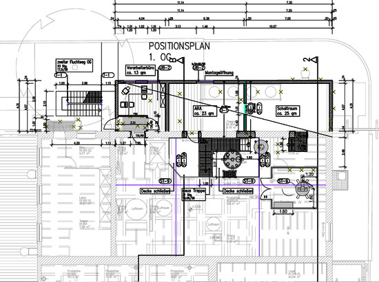 Anbau an ein Produktionsgebäude für Produktions-, EMR- und Büroraum. Neue Lüftungsanlage auf dem begehbaren Flachdach. Bestandsdachkonstruktion zum Anbau erneuern ohne Last in den Bestand abzutragen.