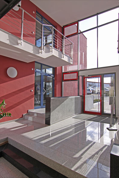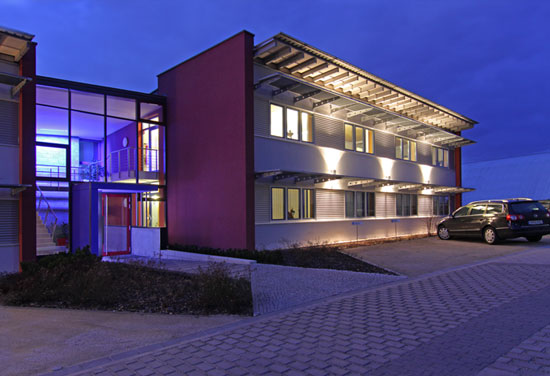Zweigeschossiges Bürogebäude mit versetzten Ebenen und mittiger Erschließung, teilbar in vier Einheiten, davon zwei mit variabler Größe.