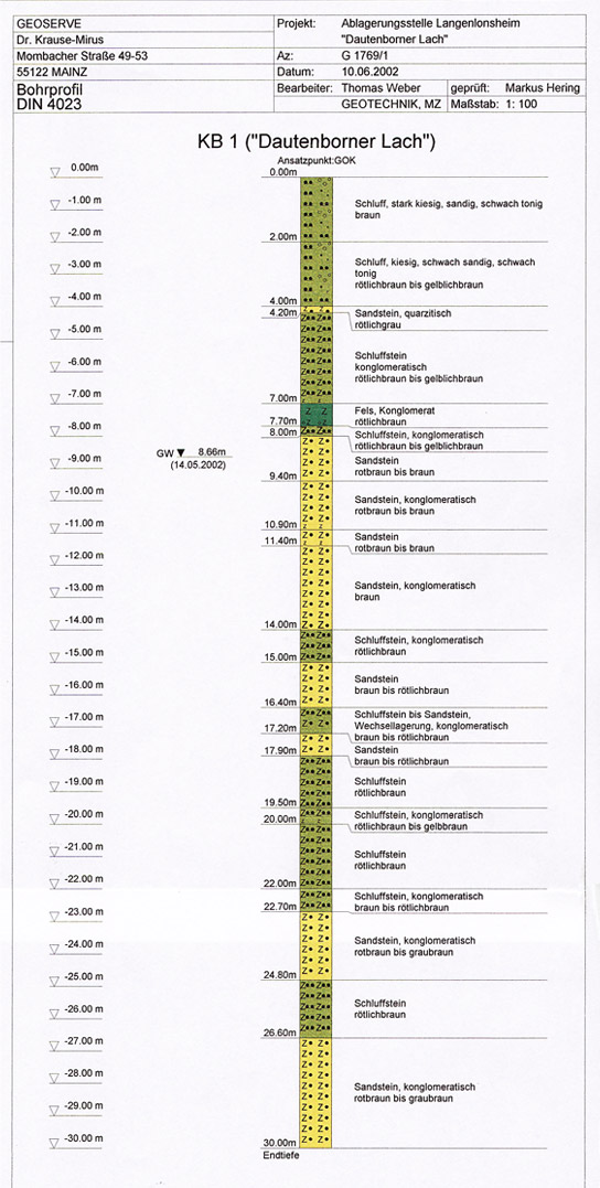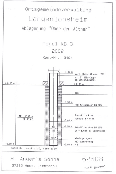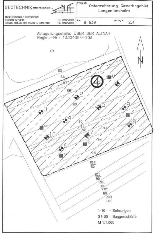 Für die Gemeinde Langenlonsheim wurde eine Grundwasserüberwachung zur Überprüfung einer möglichen Beeinträchtigung des Grundwassers durchgeführt. Hierzu wurden Untersuchungen am Ablagenkörper selbst sowie außerhalb und unterhalb der Ablagerung erforderlich.