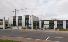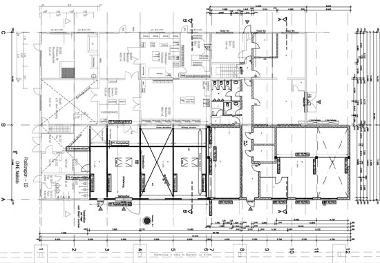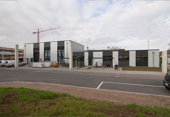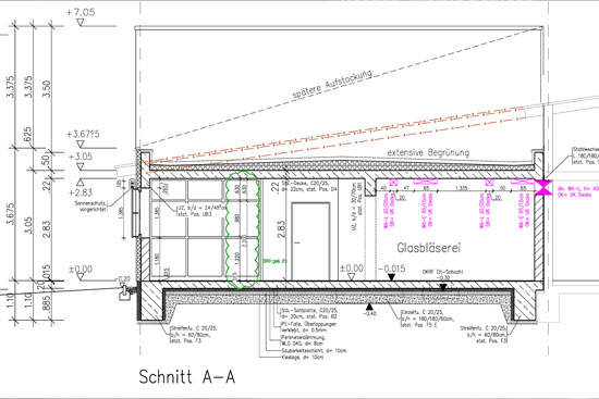 Daran angeschlossen bzw. integriert ist ein eingeschossiger ca. 4,0 m hoher Massivbau von ca. 1000 m³ umbautem Raum mit Flachdachausprägung zur späteren Aufstockung eines Bürogeschosses.