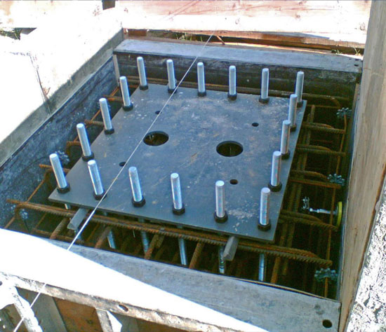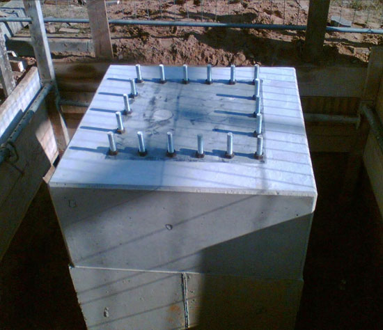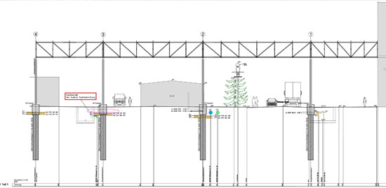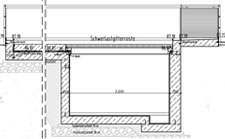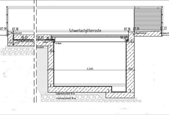 Abstellfläche für Tankwagen gemäß WHG, Grundfläche 250qm, erweiterbar auf 980 qm. Stahlbetonkonstruktion als ‚Weiße Wanne’ mit d=15cm dicker Stahlblechauskleidung, Rinne und Auffangwanne mit einem Einstauvolumen von 55 m³, Abdeckung mit Schwerlastgitterrosten für SLW60. Dreiseitiges Geländer mit Beplankung als Löschschaumbarriere.