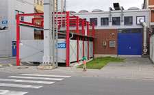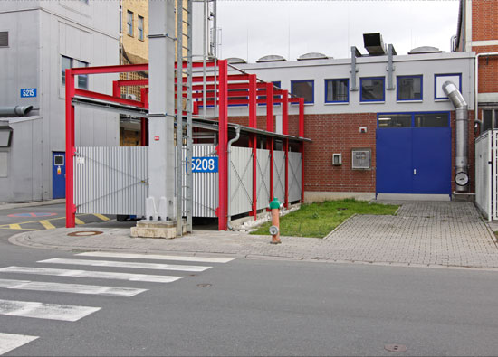 Dreiseitig geschlossene und überdeckte Stahlkonstruktion zum Aufladen der Akkumulatoren von elektrischen Gabelstaplern (rote Stahlkonstruktion).