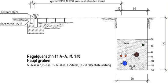 Mischwasserkanal, Ver- und Entsorgungsleitungen (Gas, Wasser, Strom und Telefon) für die Anlieger wurden verlegt bzw. erweitert.