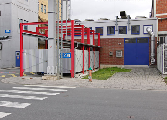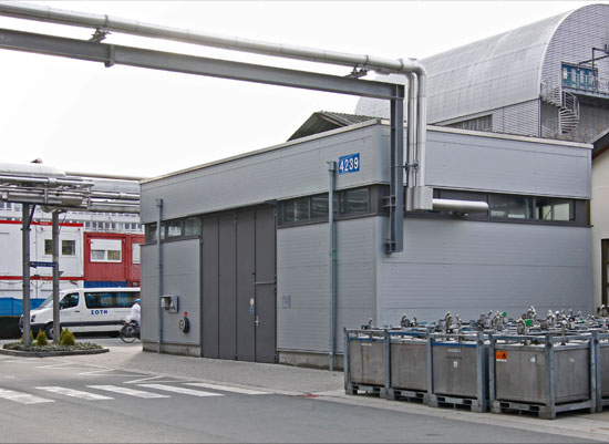 Abfalllösemittelstation mit LAU-Fläche für 3 x 20 m³ Behälter als Stahlbetonkonstruktion mit 15 mm starker Stahlblechauskleidung nach WHG, Wände und Dach in F90-Ausführung zum Schutz des angrenzenden Betriebs.