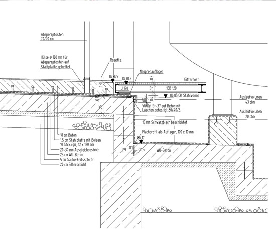 Auffangflächen gemäß WHG als beschichtete WU-Beton-Konstruktion mit definiertem Einstauvolumen und Leckageüberwachung.
