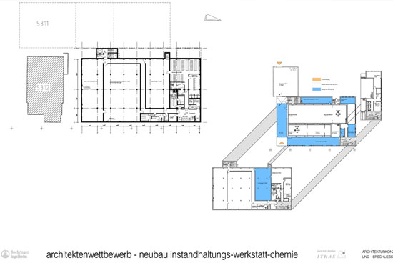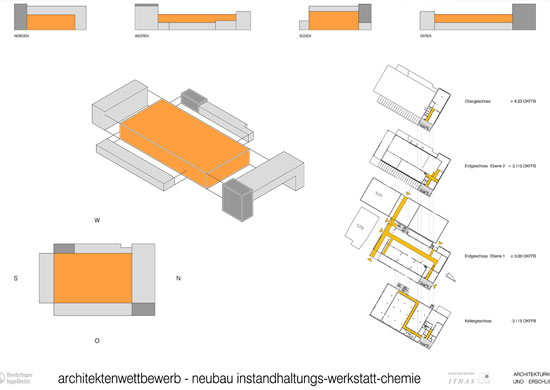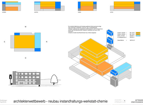 Erweiterung eines bestehenden Werkstattbetriebes durch einen hohen Hallenteil (Portalkranbetrieb) und einen flachen Werkstatt/Büroteil. Zusätzliche Sanierung bestehender Werkstattflächen. Nutzflächenerweiterung gesamt: 425 m², Umbau bestehender Werkstattflächen: 125 m², umbauter Raum neu: 2.505 m³